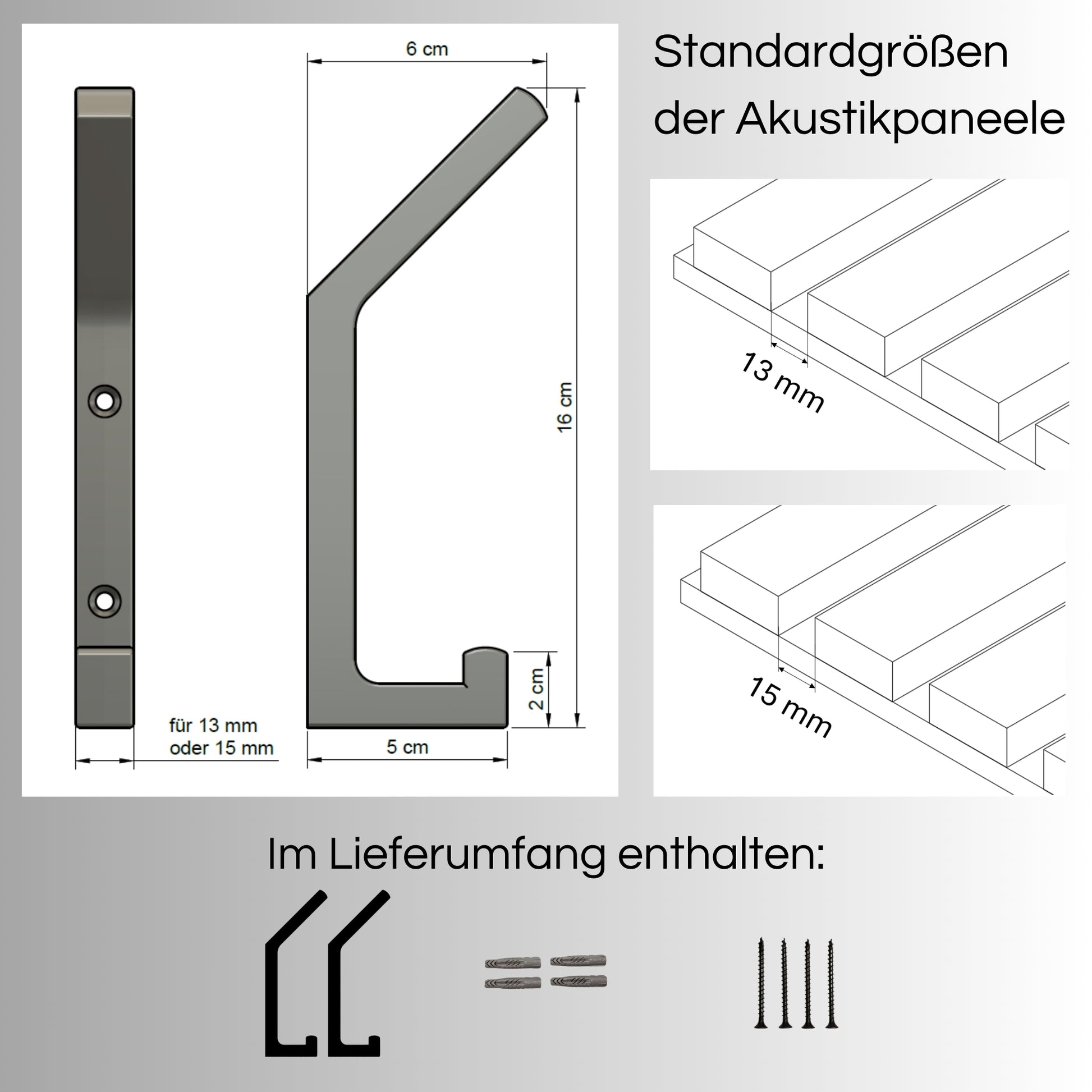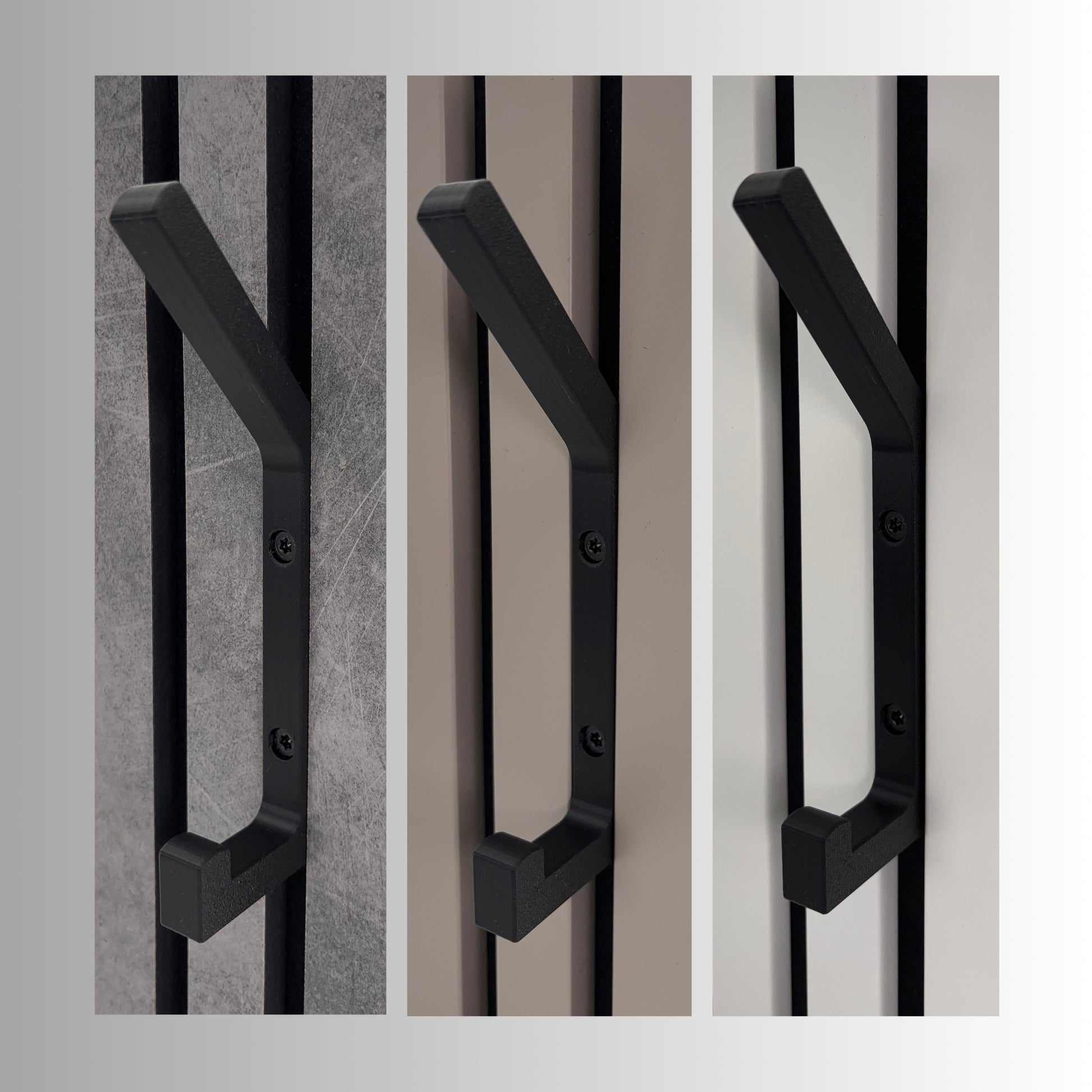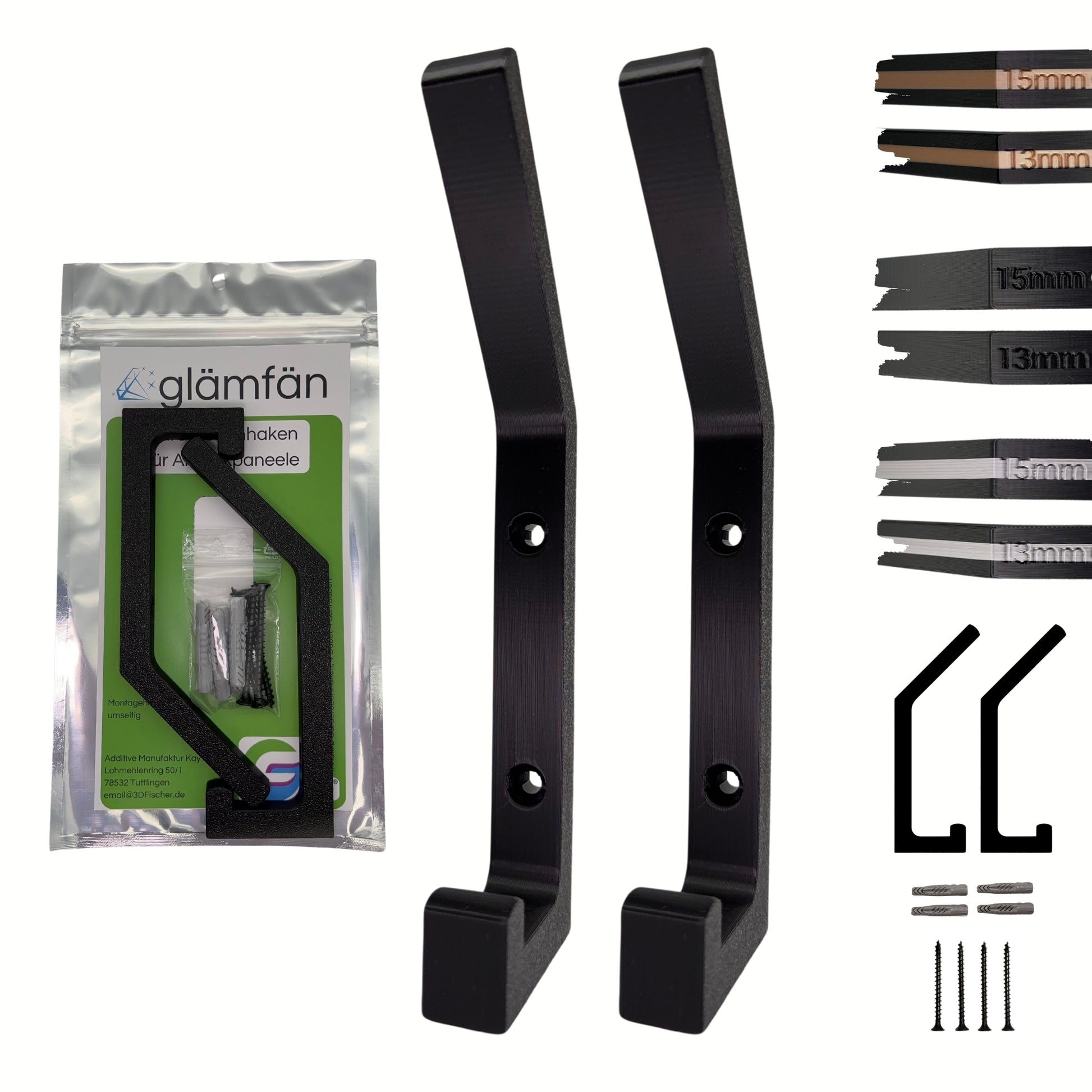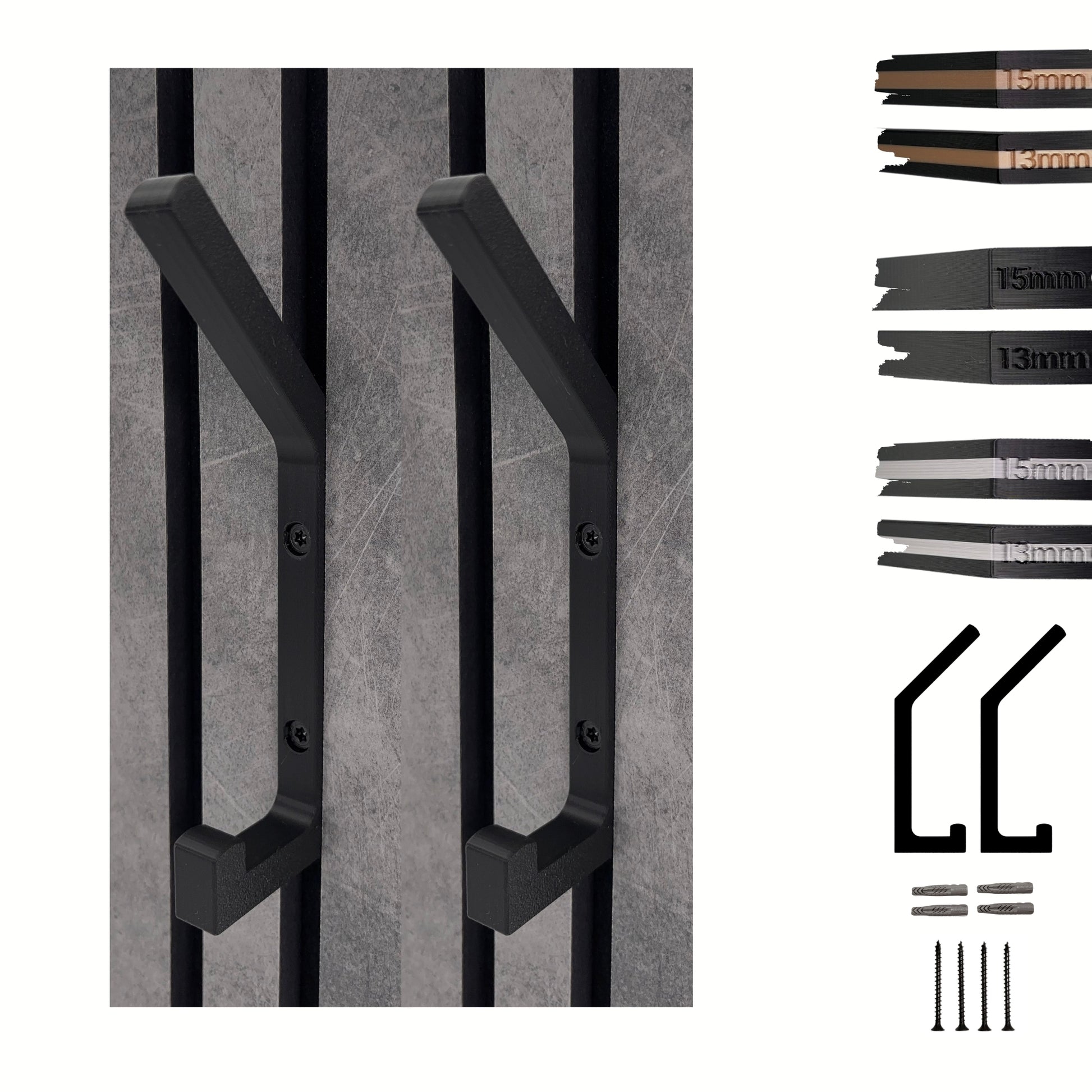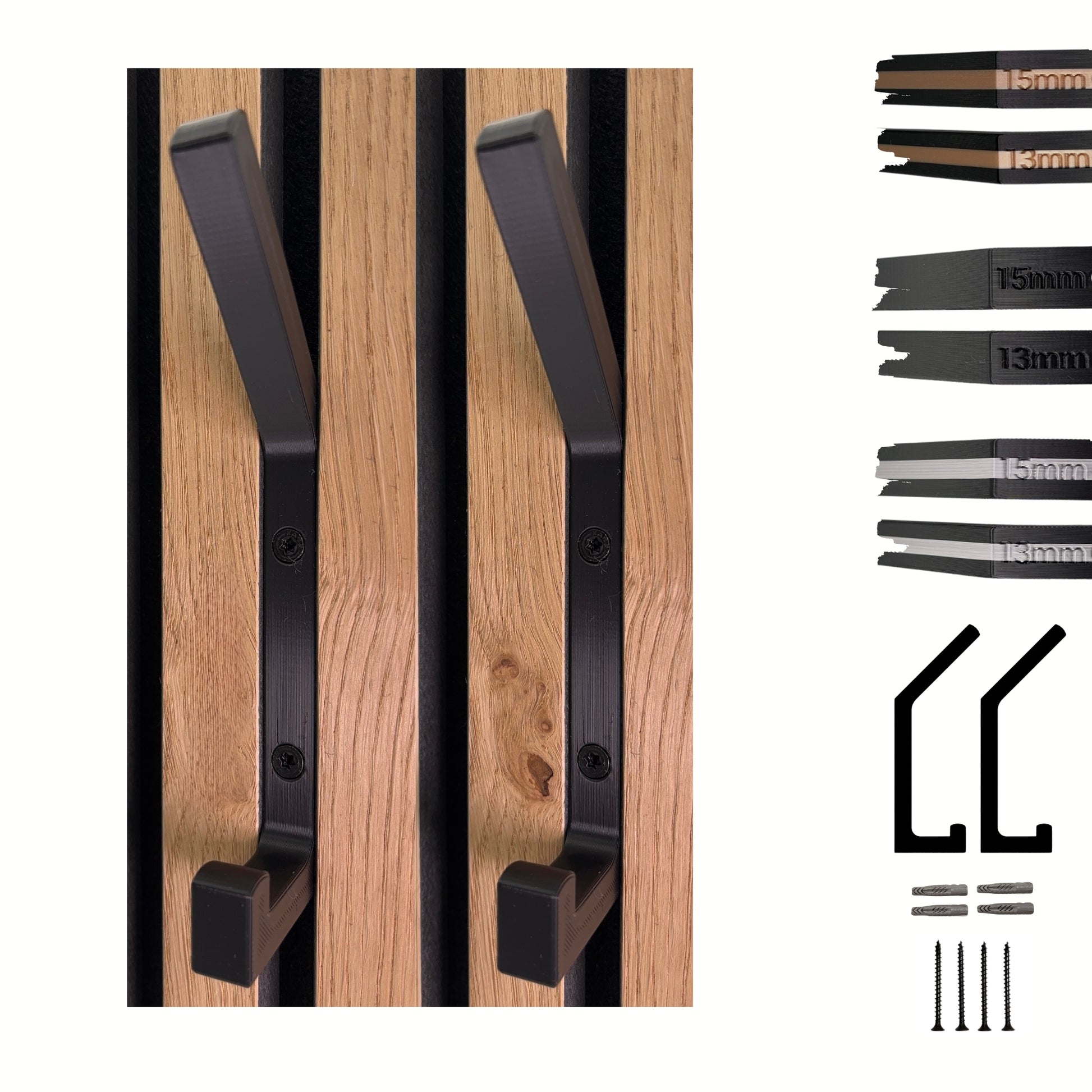 Diese Haken sind nicht nur praktisch, sondern auch ein echtes Design-Statement. Gefertigt im präzisen 3D-Druckverfahren und in mattem Schwarz, fügen sie sich nahtlos in jedes Interieur ein. Das Besondere: Sie passen perfekt auf Akustikpaneele mit 13mm oder 15mm Lamellenabstand. Bitte messen Sie vorab Ihre Paneele.