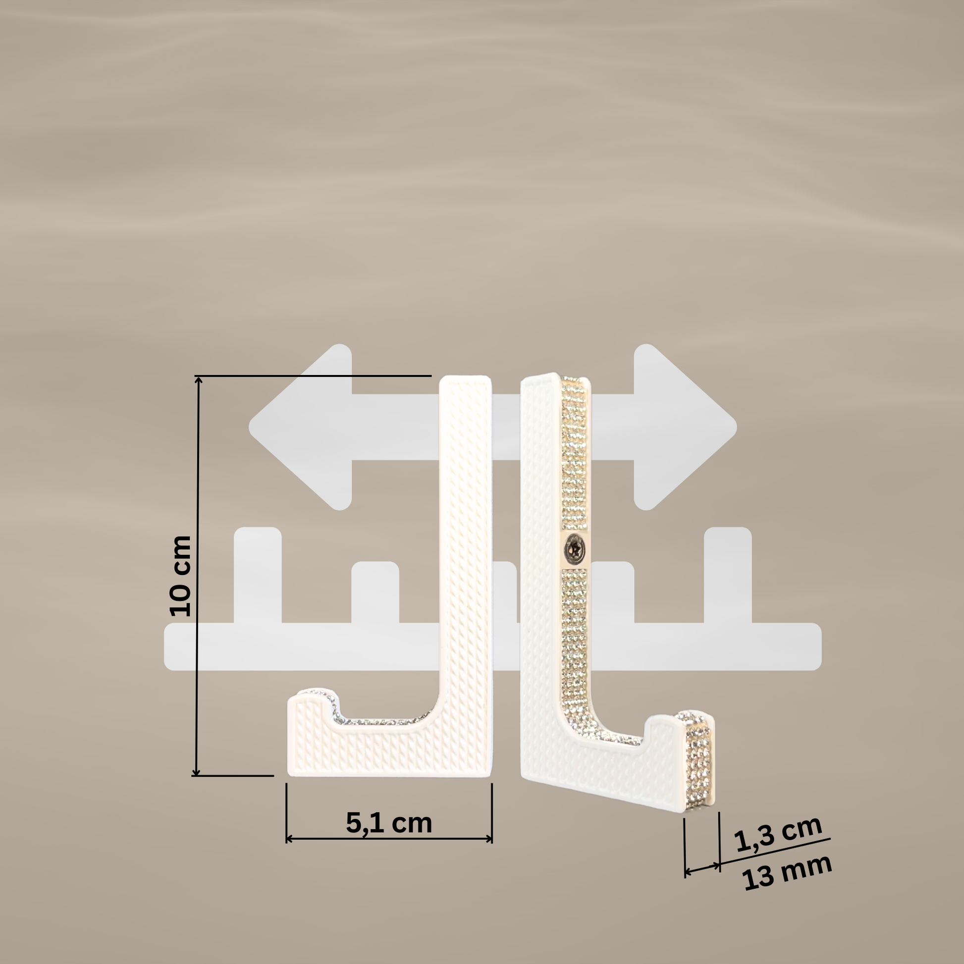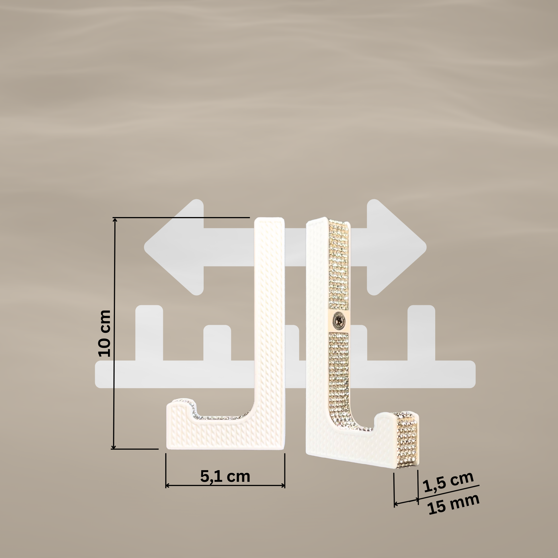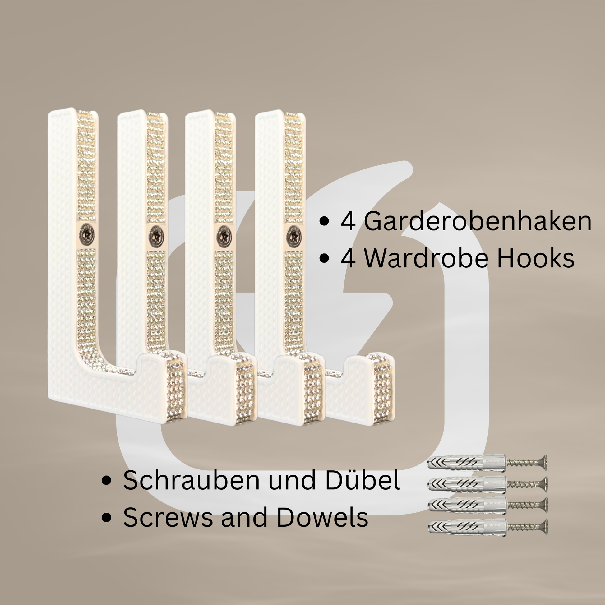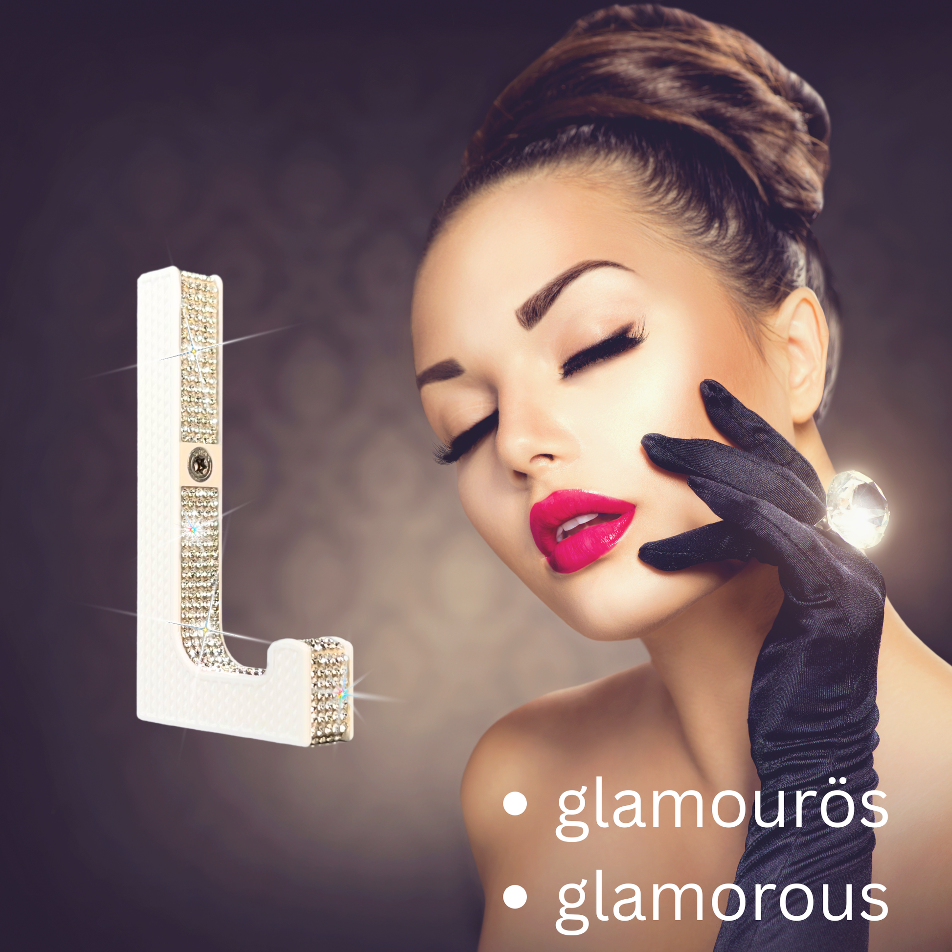 Die handgefertigten kurzen glämfän® Garderobenhaken verbinden stilvollen Glamour mit langlebiger Funktion. Jeder Haken wird regional in Deutschland produziert und besteht aus hochwertigem Bio-Kunststoff in edlem Weiß. Veredelt mit funkelnden Strasssteinen, wird er zum stilvollen Blickfang in Flur, Schlafzimmer, Ankleidezimmer oder Boutique.