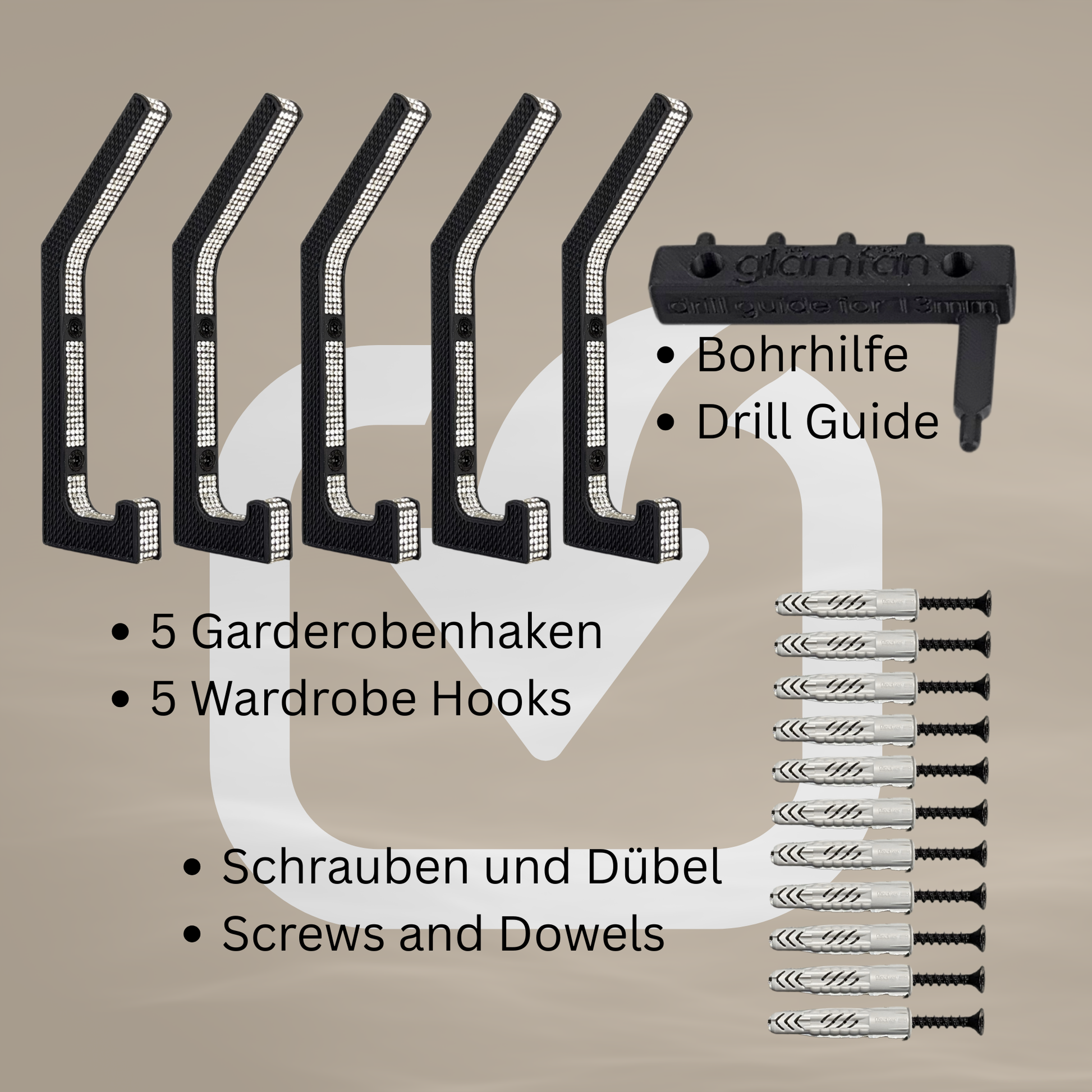 Lieferumfang: 3 oder 5 Garderobenhaken, 1 Bohrhilfe, 6 oder 10 Dübel, 6 oder 10 schwarze Schrauben